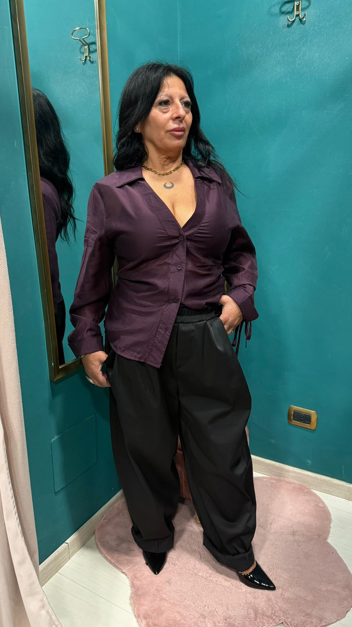 Camicia con scollo a V dettaglio laterale con laccetto sul polsino