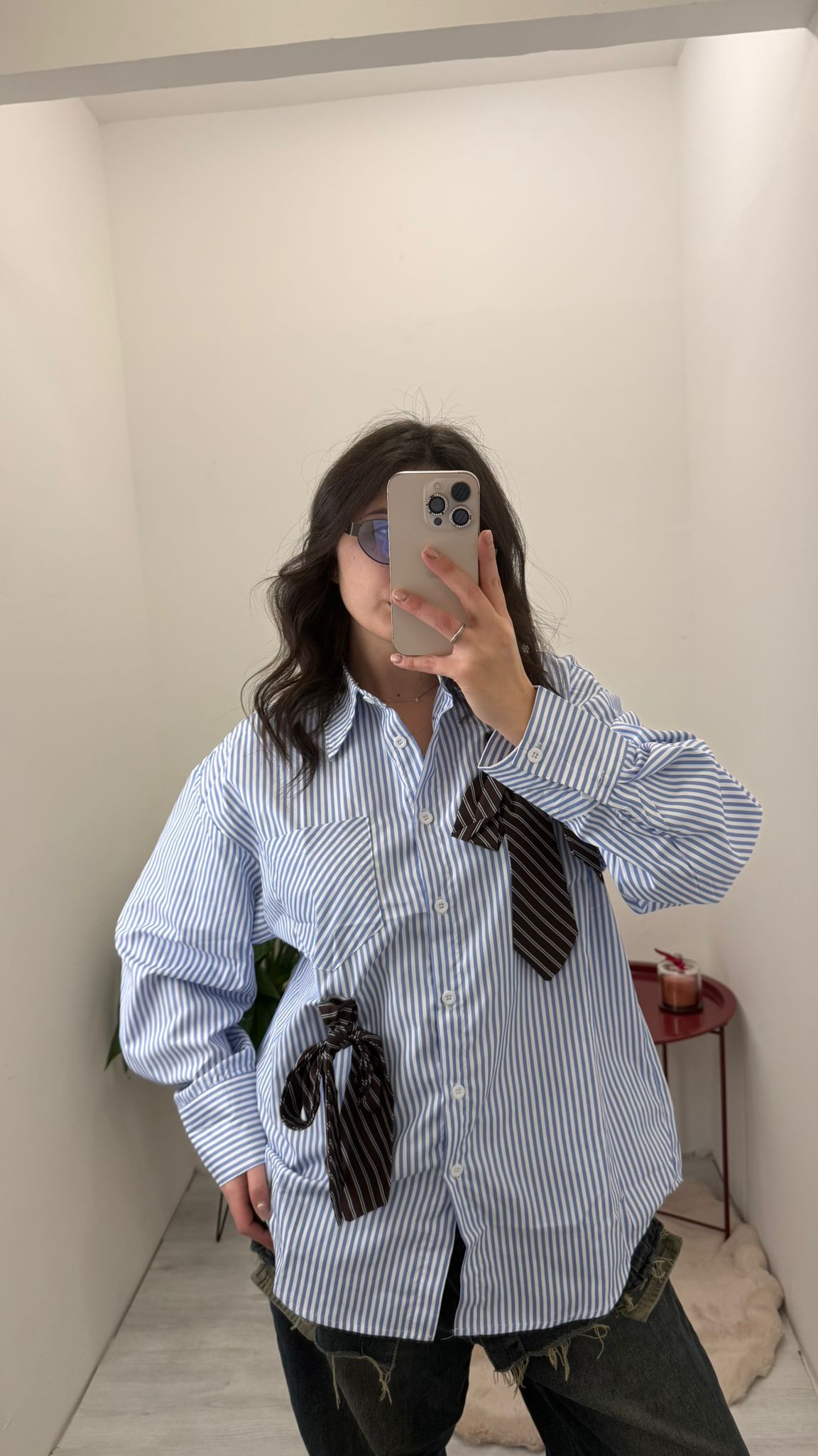 Camicia in cotone con righe dritte e particolarità di due fiocchi
