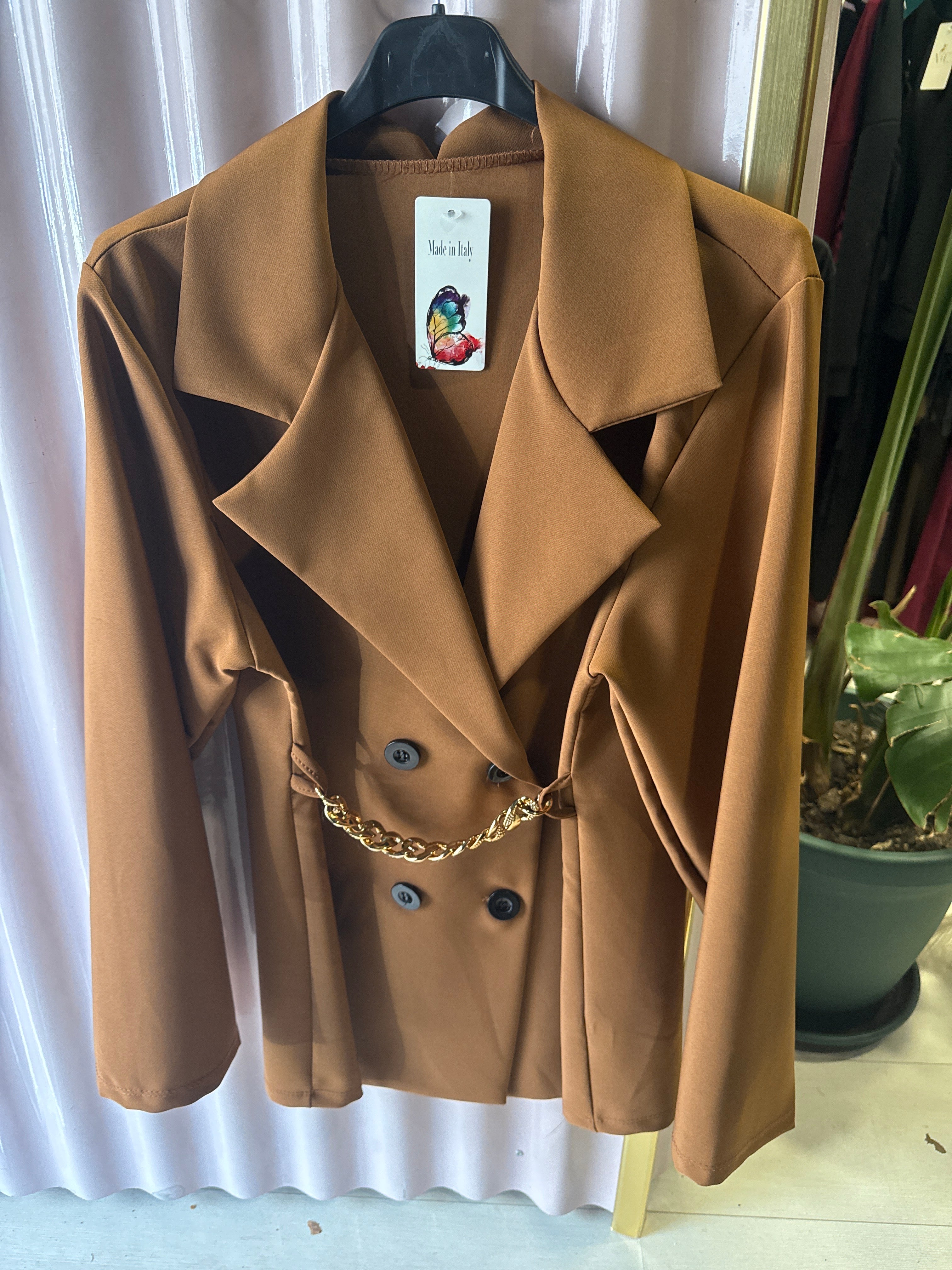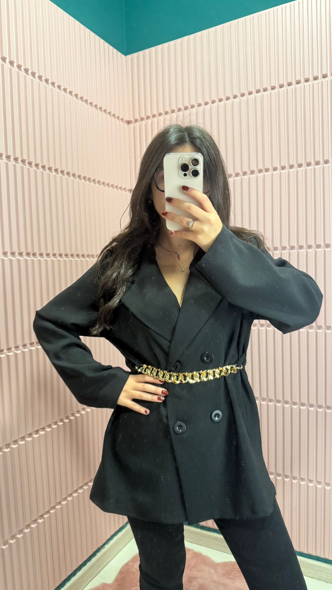 Questa Giacca  unisce stile classico e dettagli moderni per un look sofisticato ma deciso. Realizzata in un tessuto strutturato e morbido al tatto, presenta una linea leggermente oversize  che valorizza la figura senza rinunciare al comfort.La cintura a catena , che sottolinea il punto vita con un tocco glamour e dona luce al total black. Il doppio bottone frontale  e il taglio reverse ampio  completano l’outfit con eleganza.