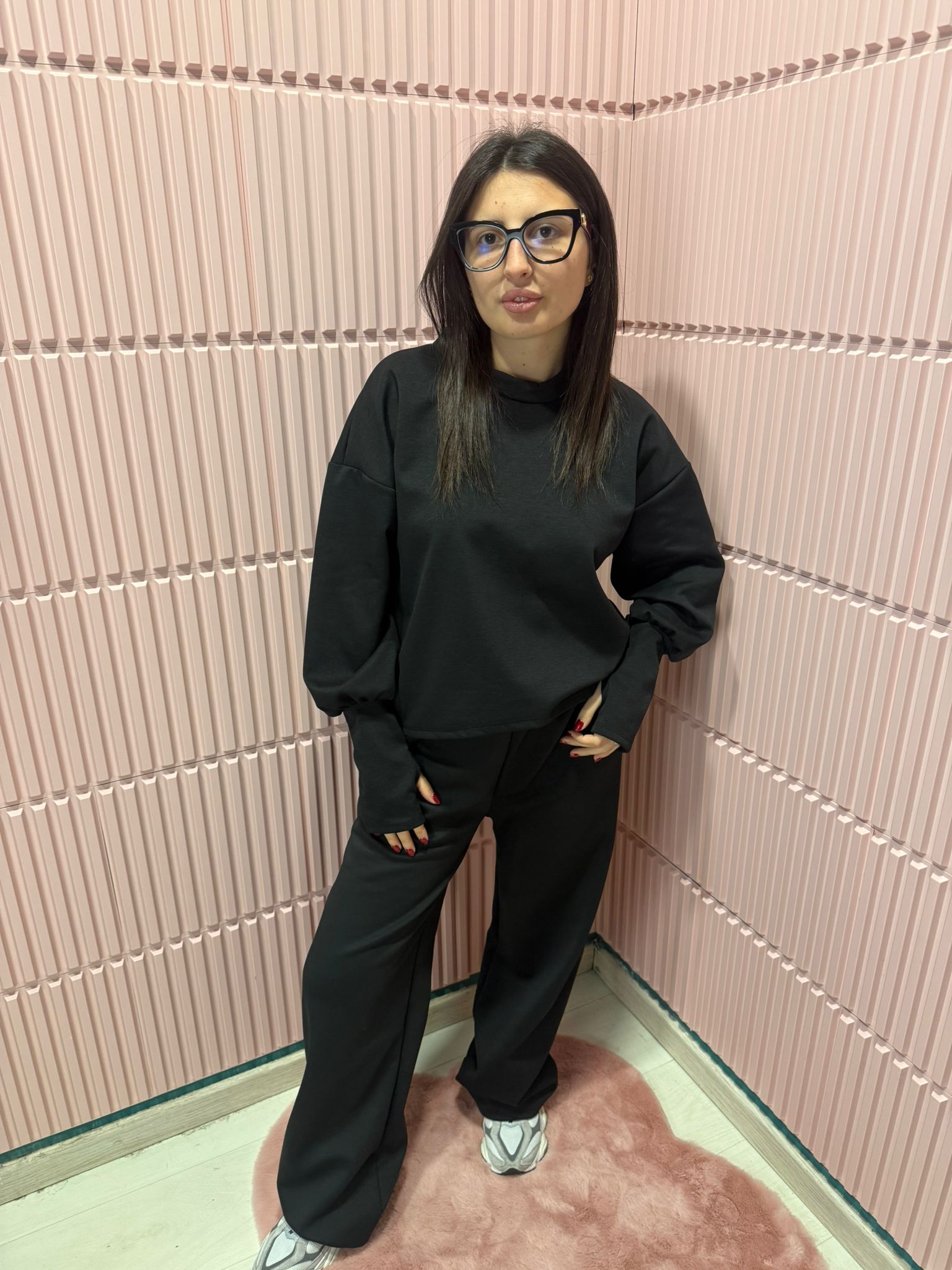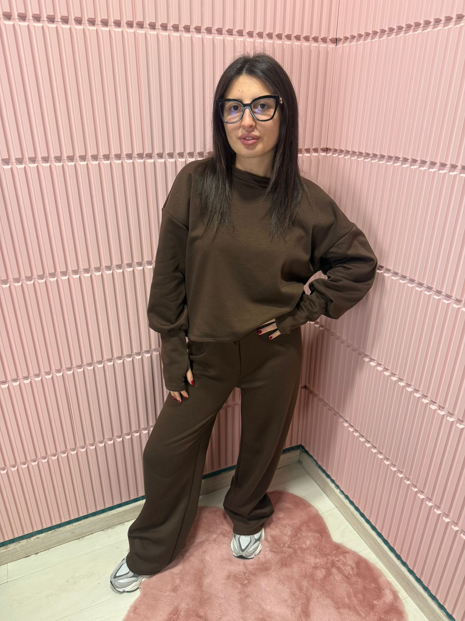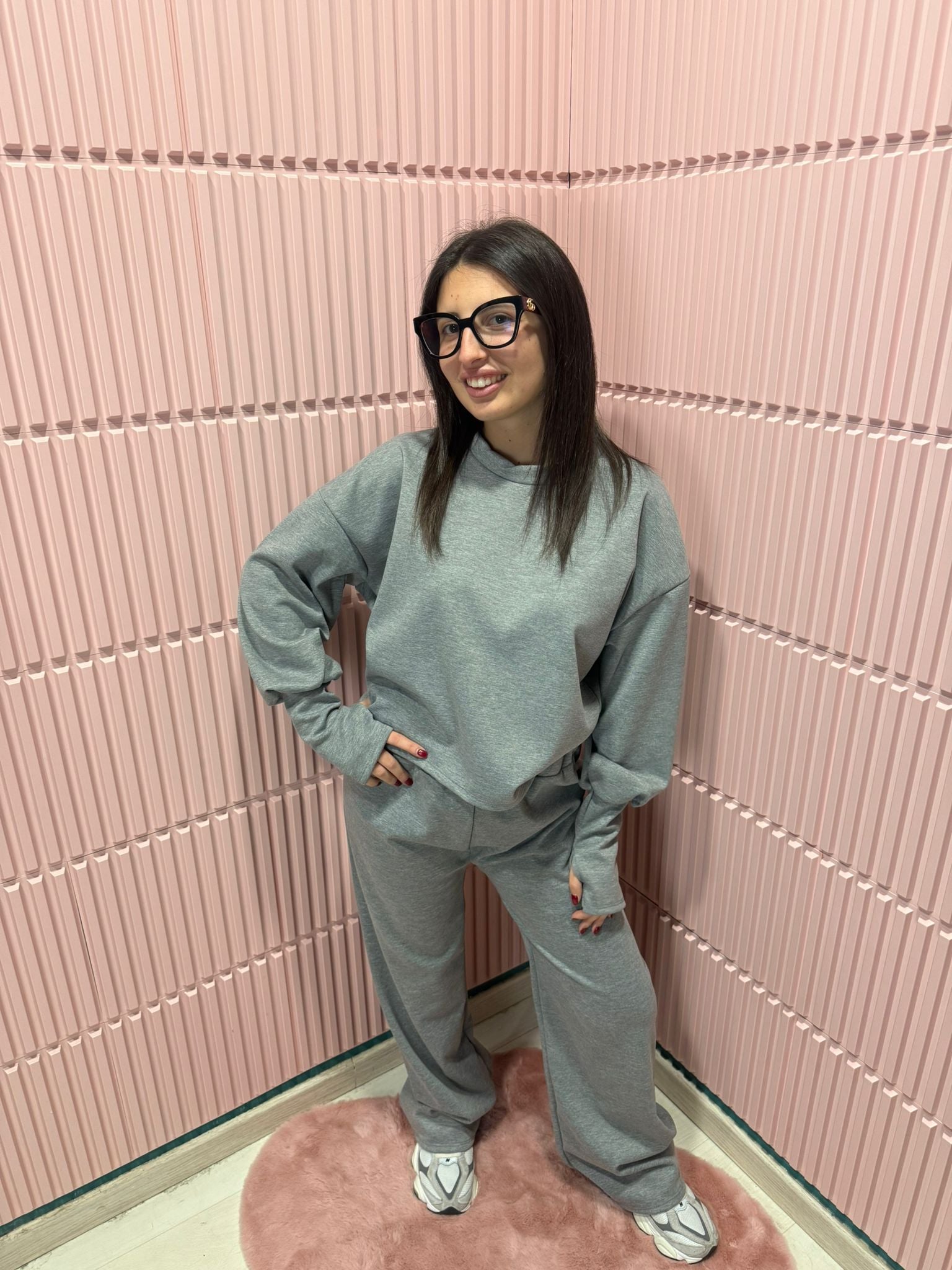 Coordinato in tessuto felpato, ideale per chi cerca comfort e stile in un unico look. La felpa presenta una linea morbida, maniche lunghe e polsini con apertura per il pollice, perfetti per un tocco sportivo e contemporaneo. I pantaloni, dal taglio ampio e rilassato, offrono una vestibilità comoda e casual, adatta a ogni momento della giornata
