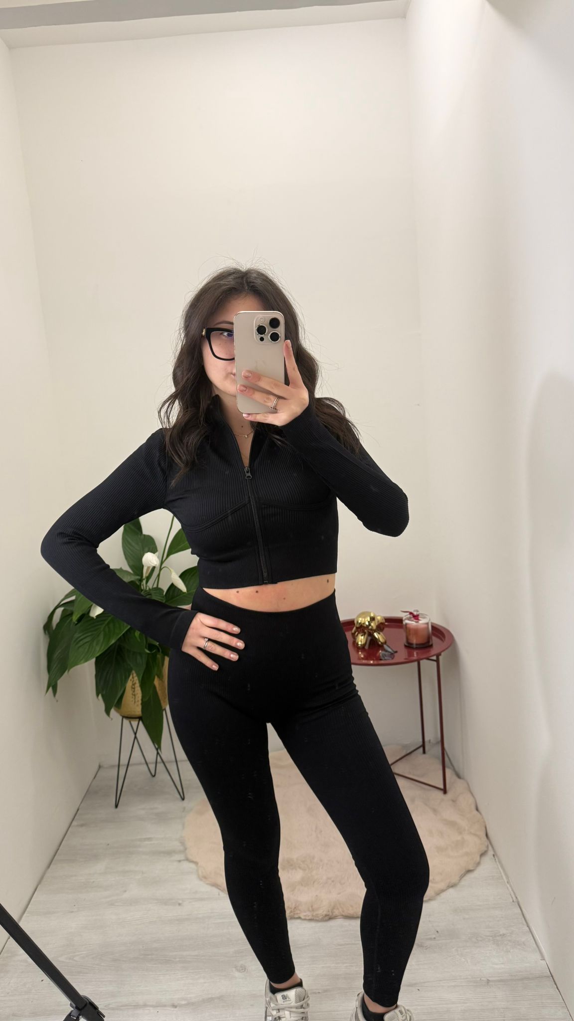 Coordinato per palestra a costine super modellante con giacchetto crop con zip e guantino leggings con push-up