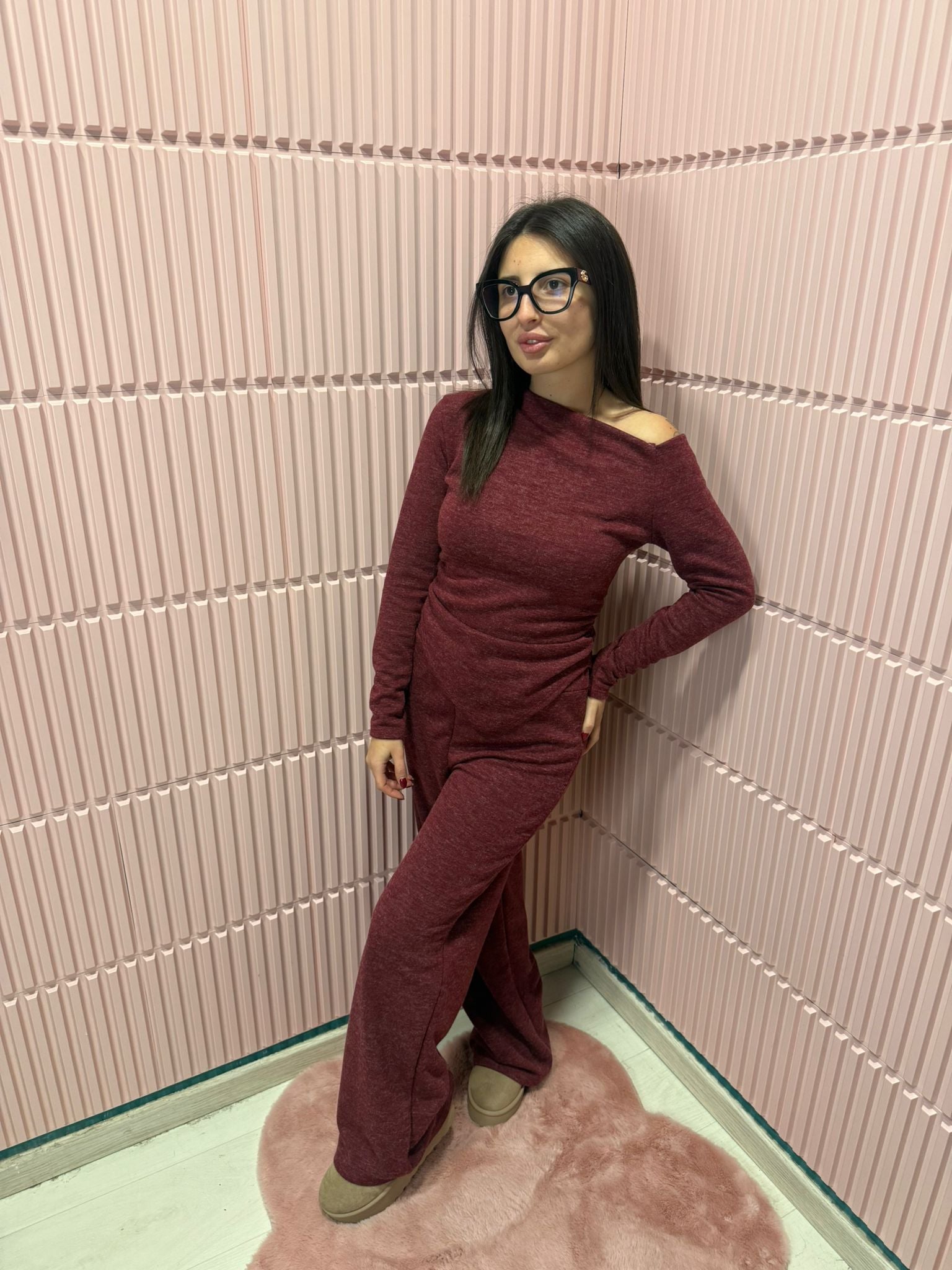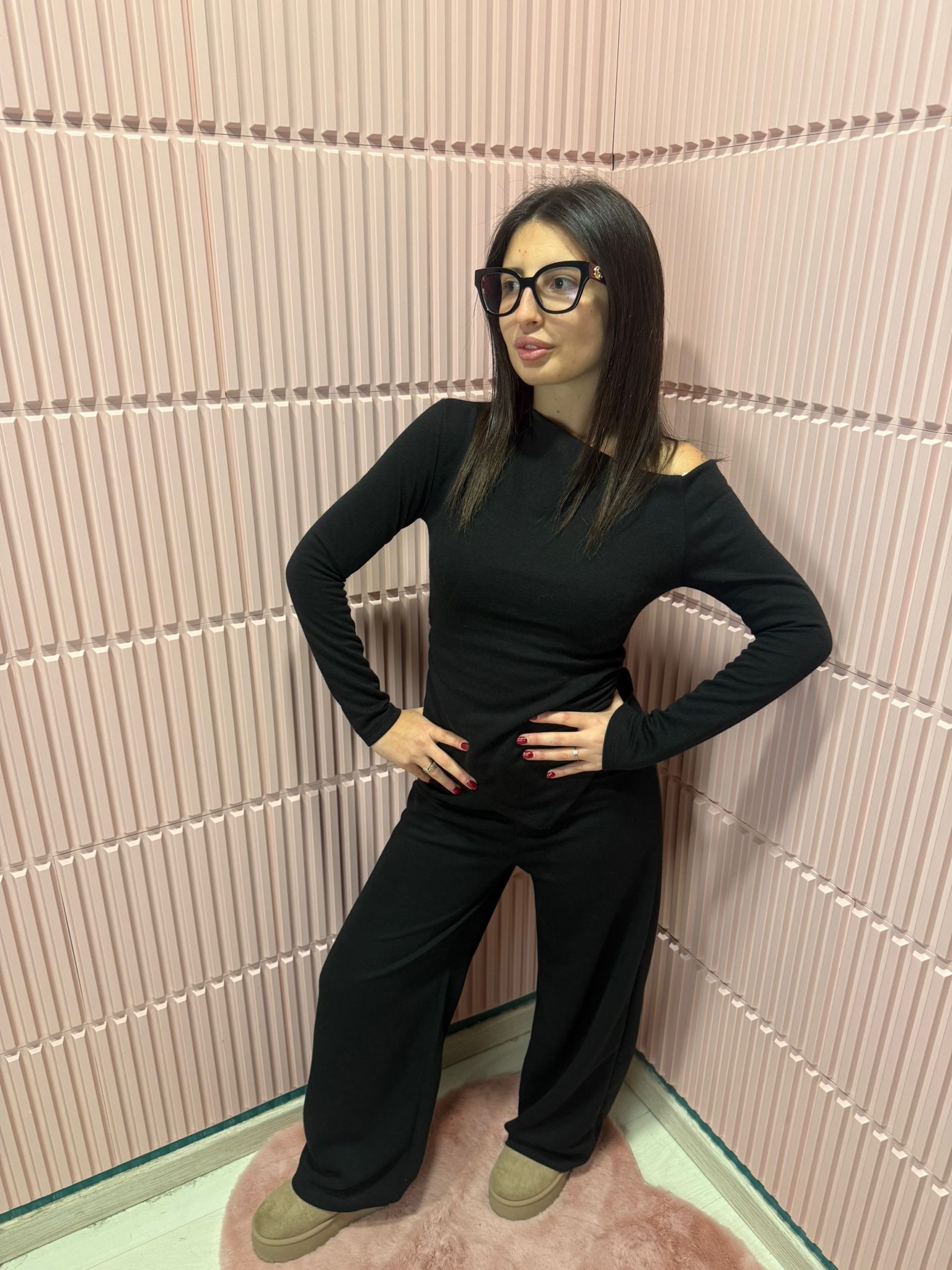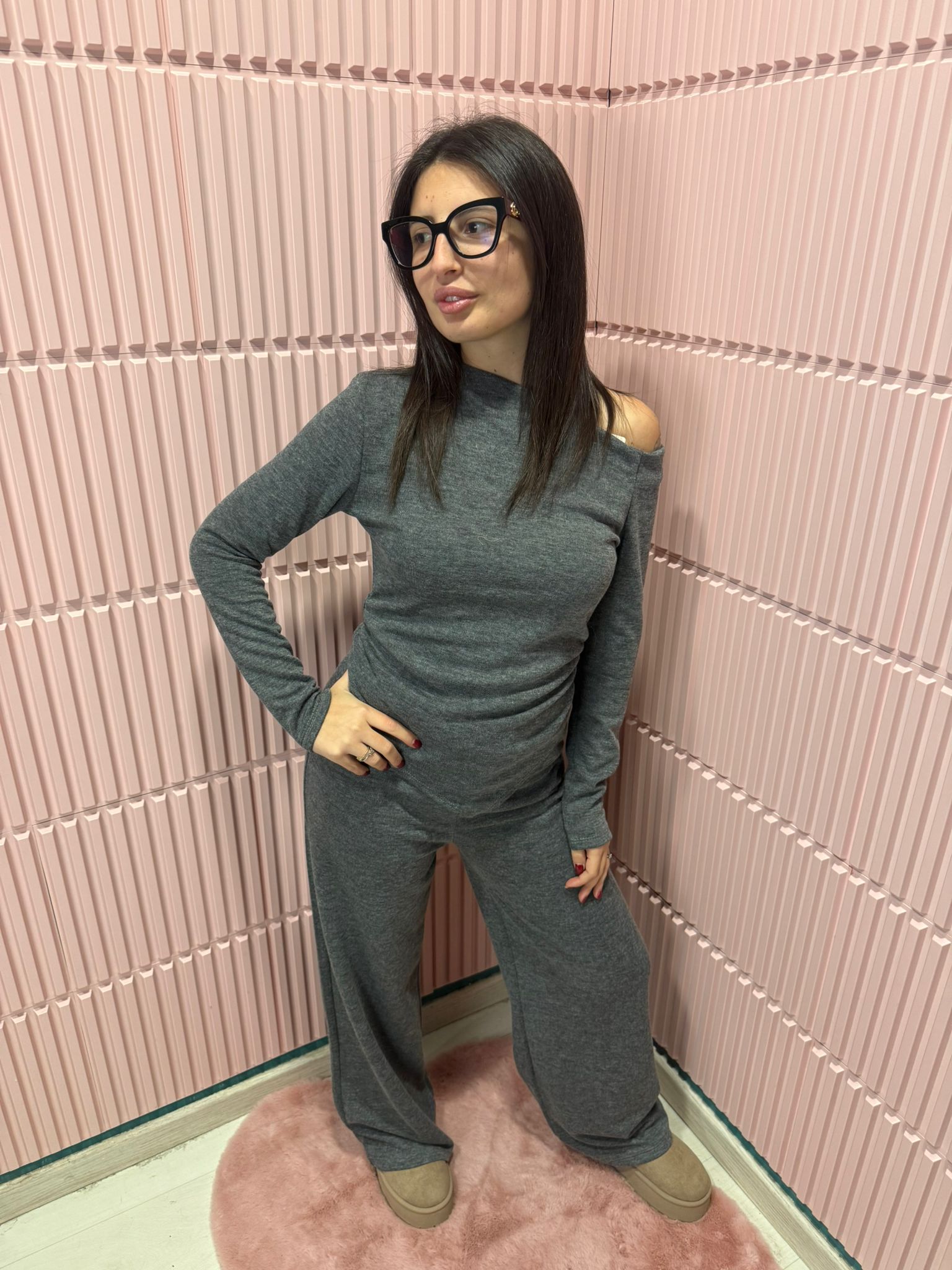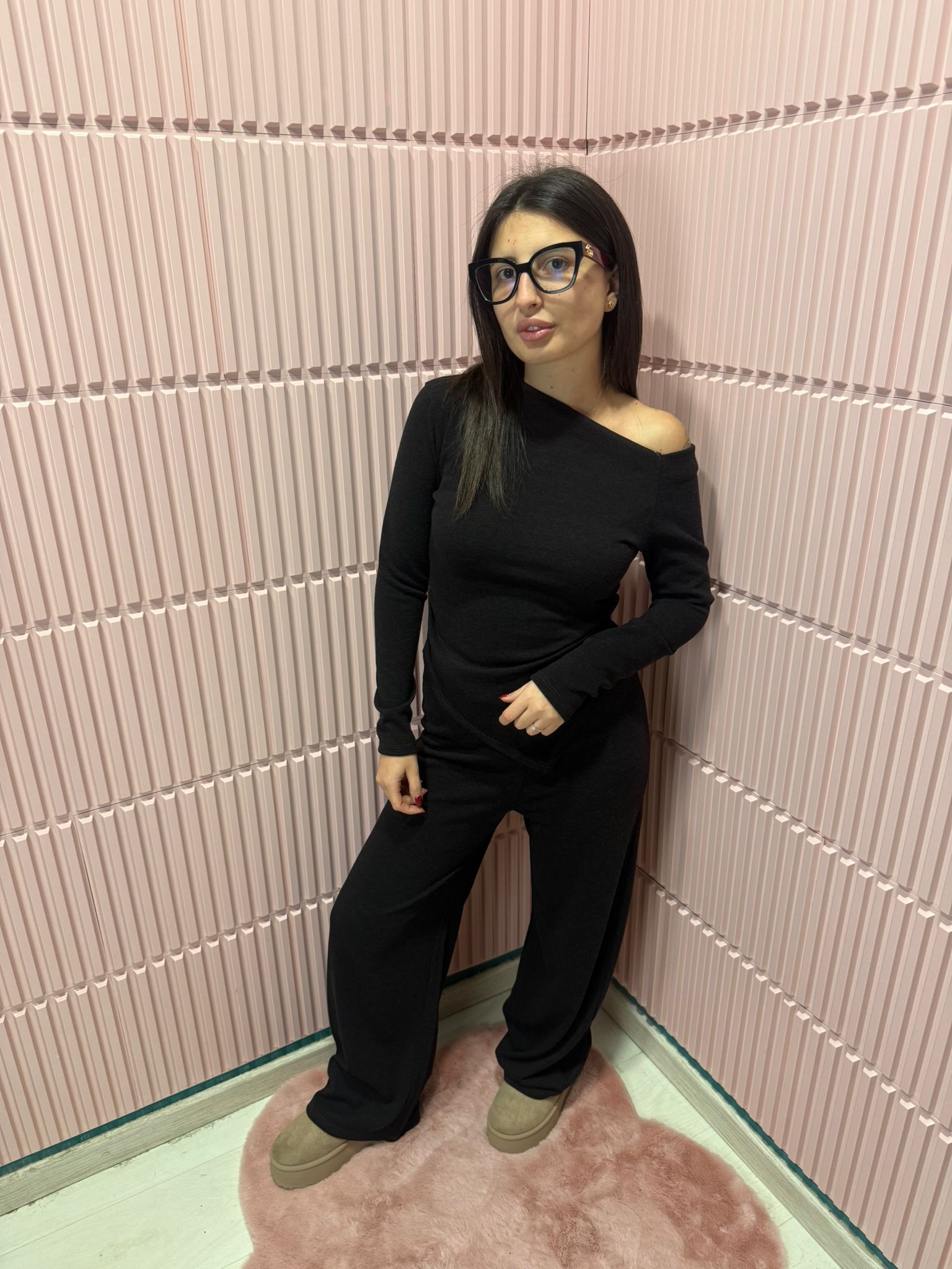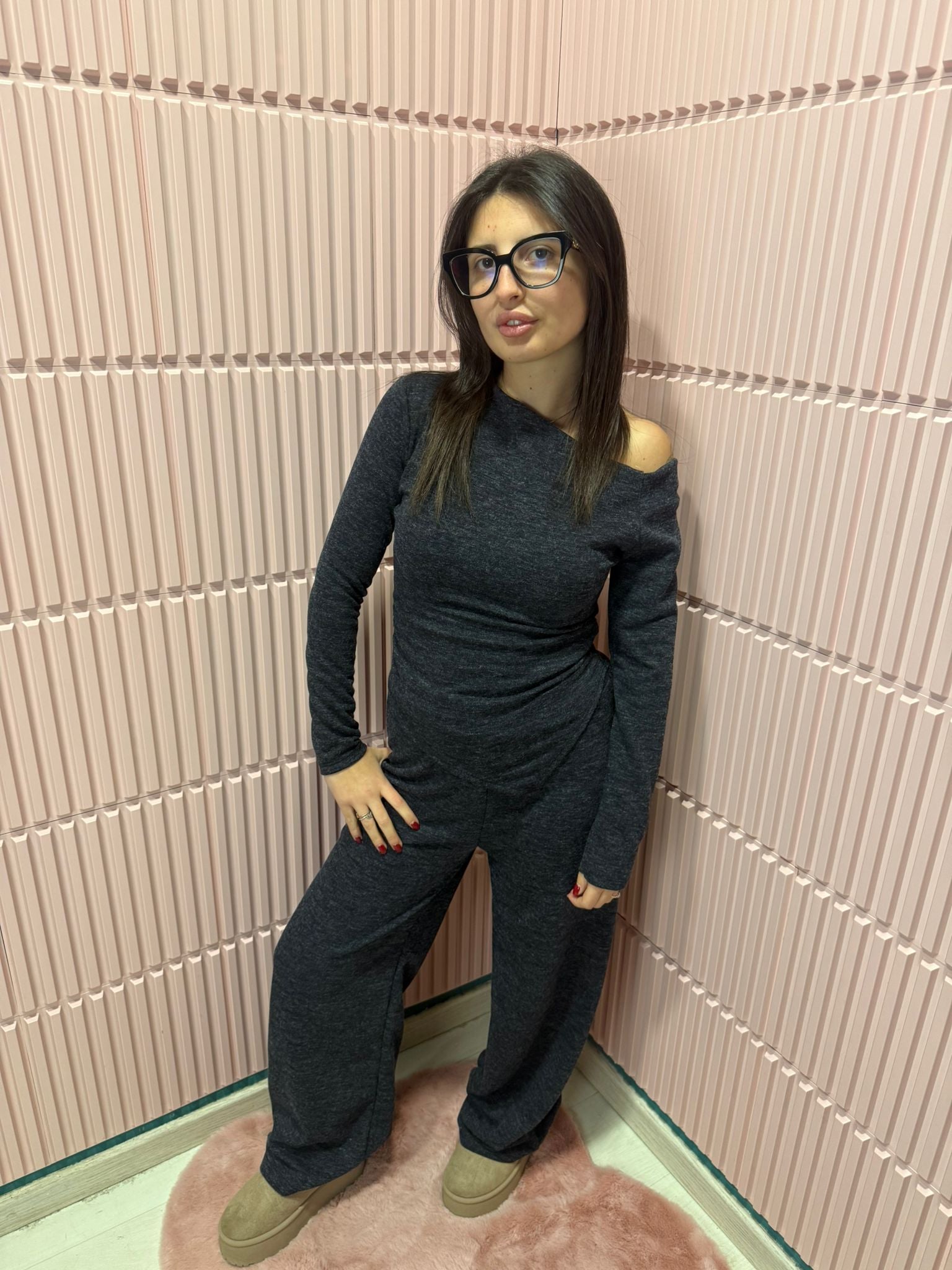 Coordinato donna, raffinato e confortevole, pensato per valorizzare la silhouette senza rinunciare alla comodità. La maglia a maniche lunghe presenta uno scollo asimmetrico che aggiunge un tocco moderno e femminile. I pantaloni a gamba larga garantiscono una vestibilità morbida e fluida, ideale per un look casual chic da giorno o per momenti di relax.