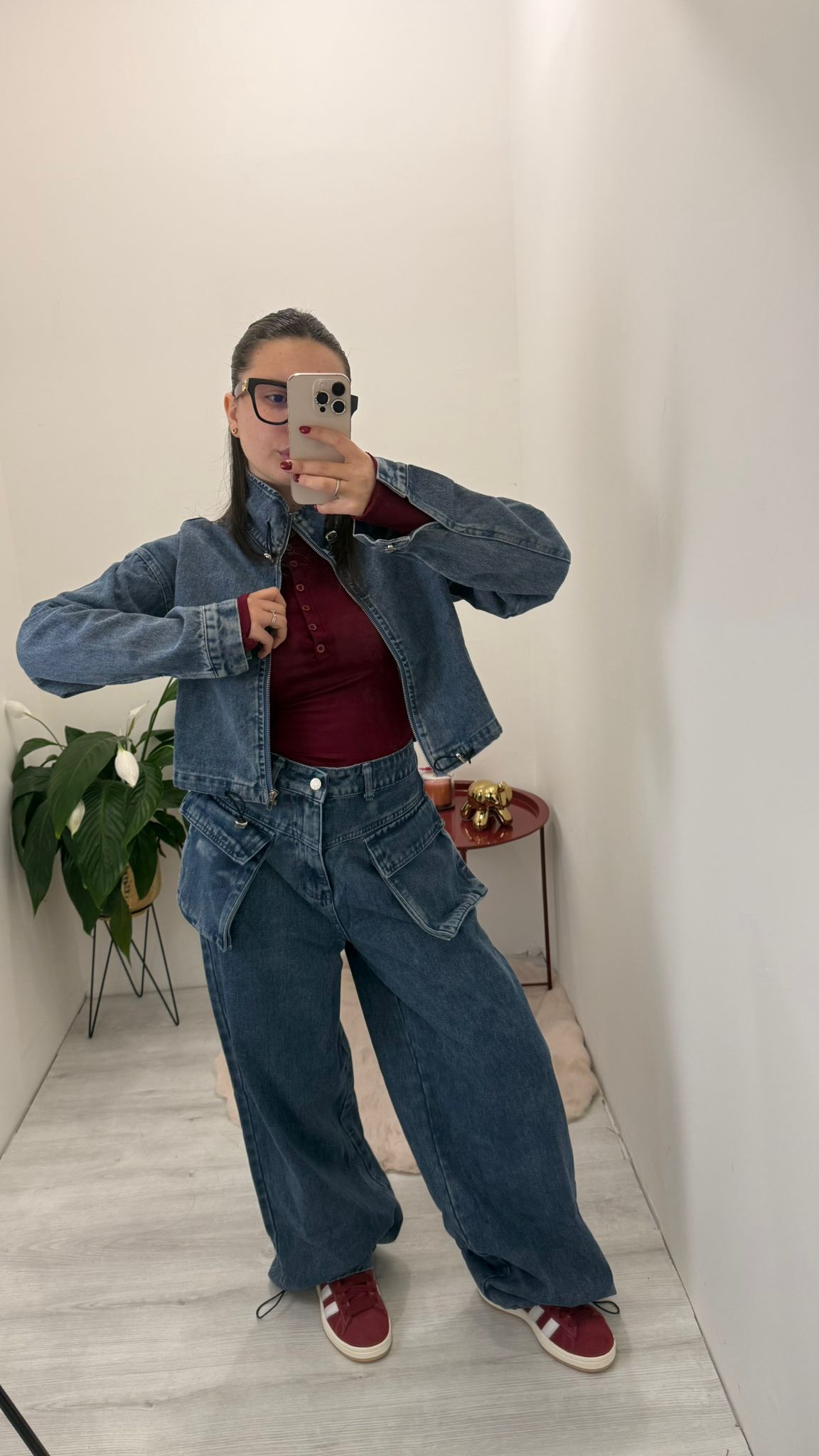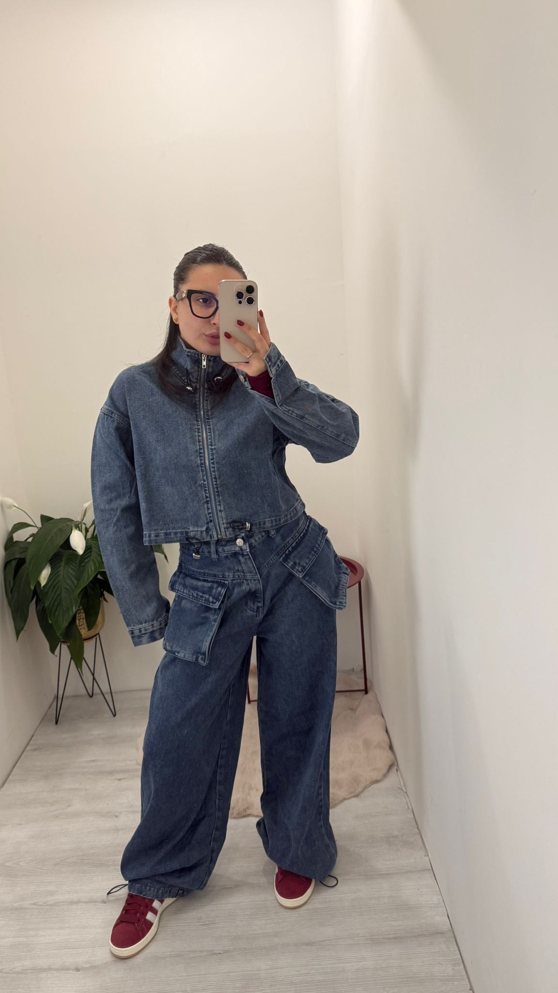 Un coordinato in denim dal carattere deciso e contemporaneo, pensato per chi ama uno stile urban con dettagli di tendenza. Il Coordinato Miami è composto da giacca cropped con zip frontale e pantalone wide leg con maxi tasche applicate, per un look forte ma versatile.