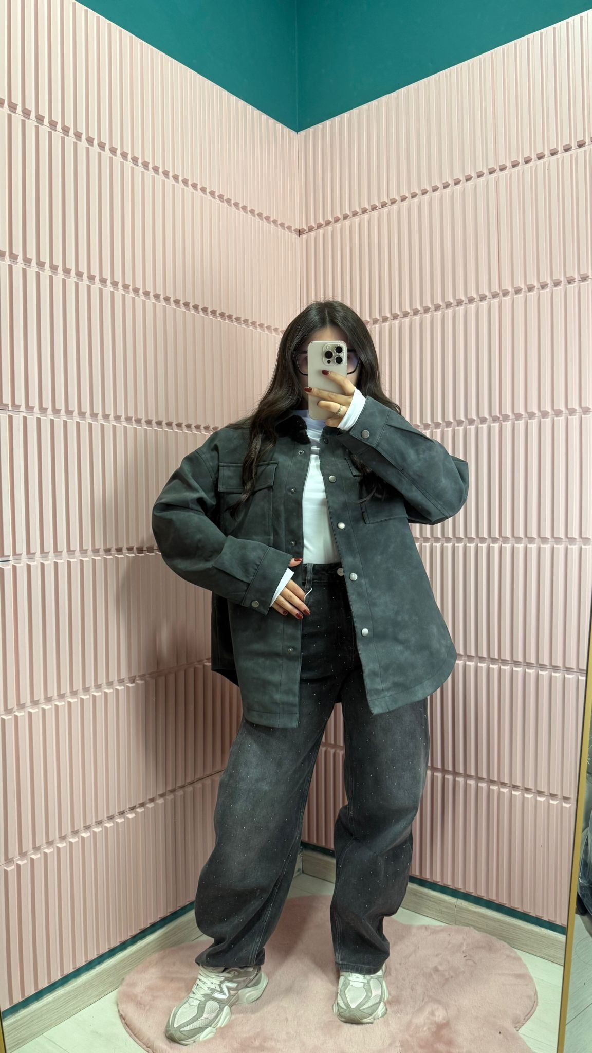 Giacca oversize in ecopelle color grigio fumo, dal design moderno e versatile. Dotata di bottoni a pressione unisce comfort e stile in un capo perfetto per la mezza stagione. Il taglio morbido la rende ideale da indossare sia come giacca leggera che come sovracamicia trendy. Perfetta per un look casual ma curato, da abbinare a jeans o pantaloni ampi per un tocco urbano e contemporaneo.
