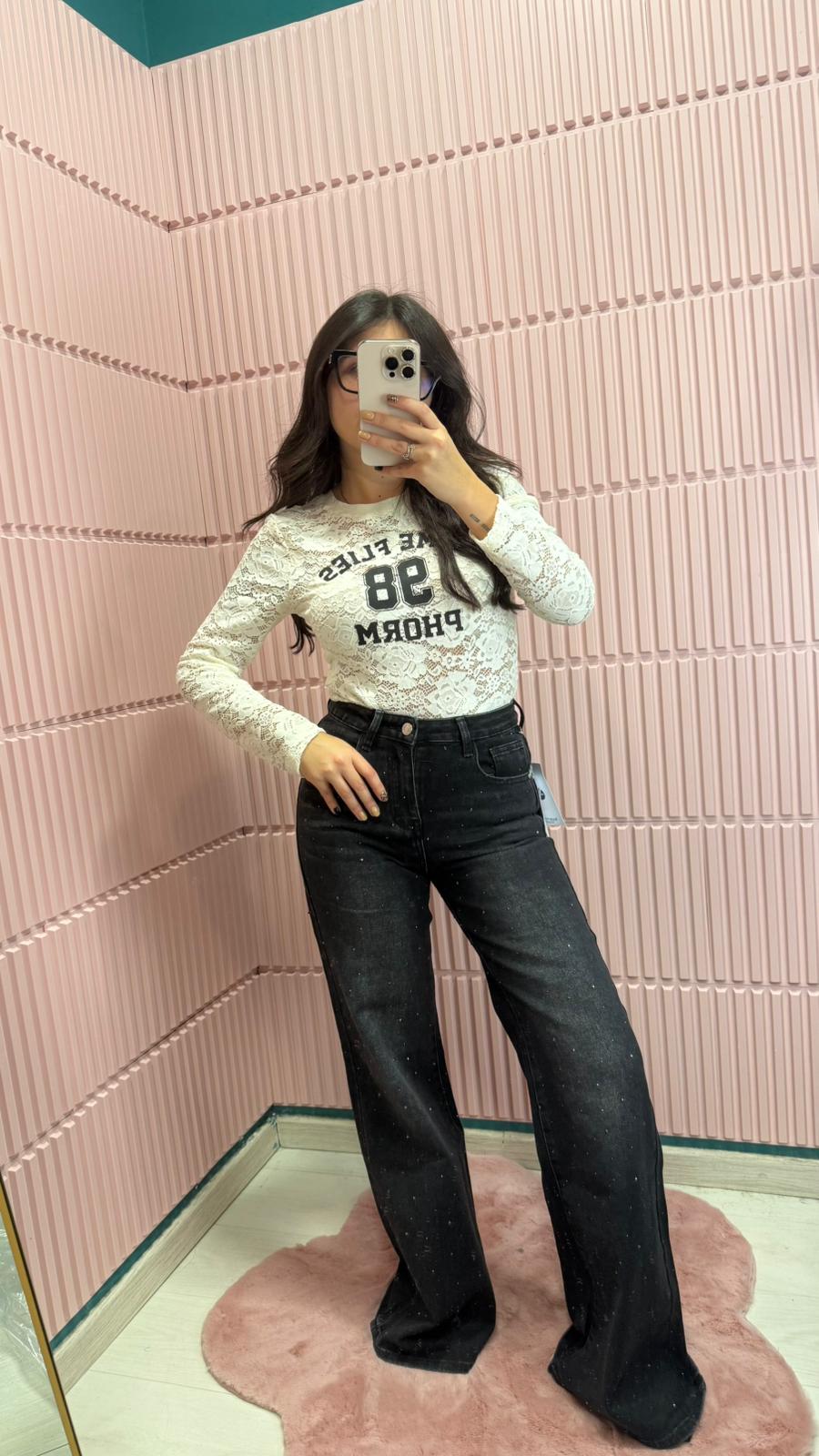 Jeans con applicazioni di brillantini color argento su tutto il capo
