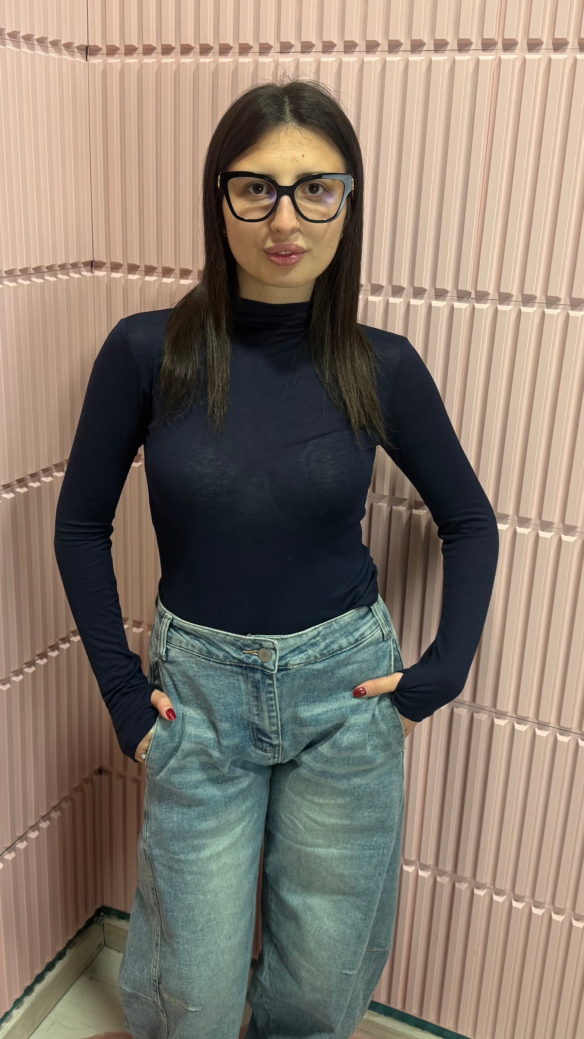 Maglia a maniche lunghe, dal tessuto morbido ed elasticizzato che avvolge la figura con eleganza. Il design minimal con collo leggermente alto la rende un capo essenziale ma raffinato, perfetto da indossare da sola o come base sotto blazer, giacche e maglioni. Versatile, ideale per creare outfit impeccabili in ogni stagione. Un Must-Have.