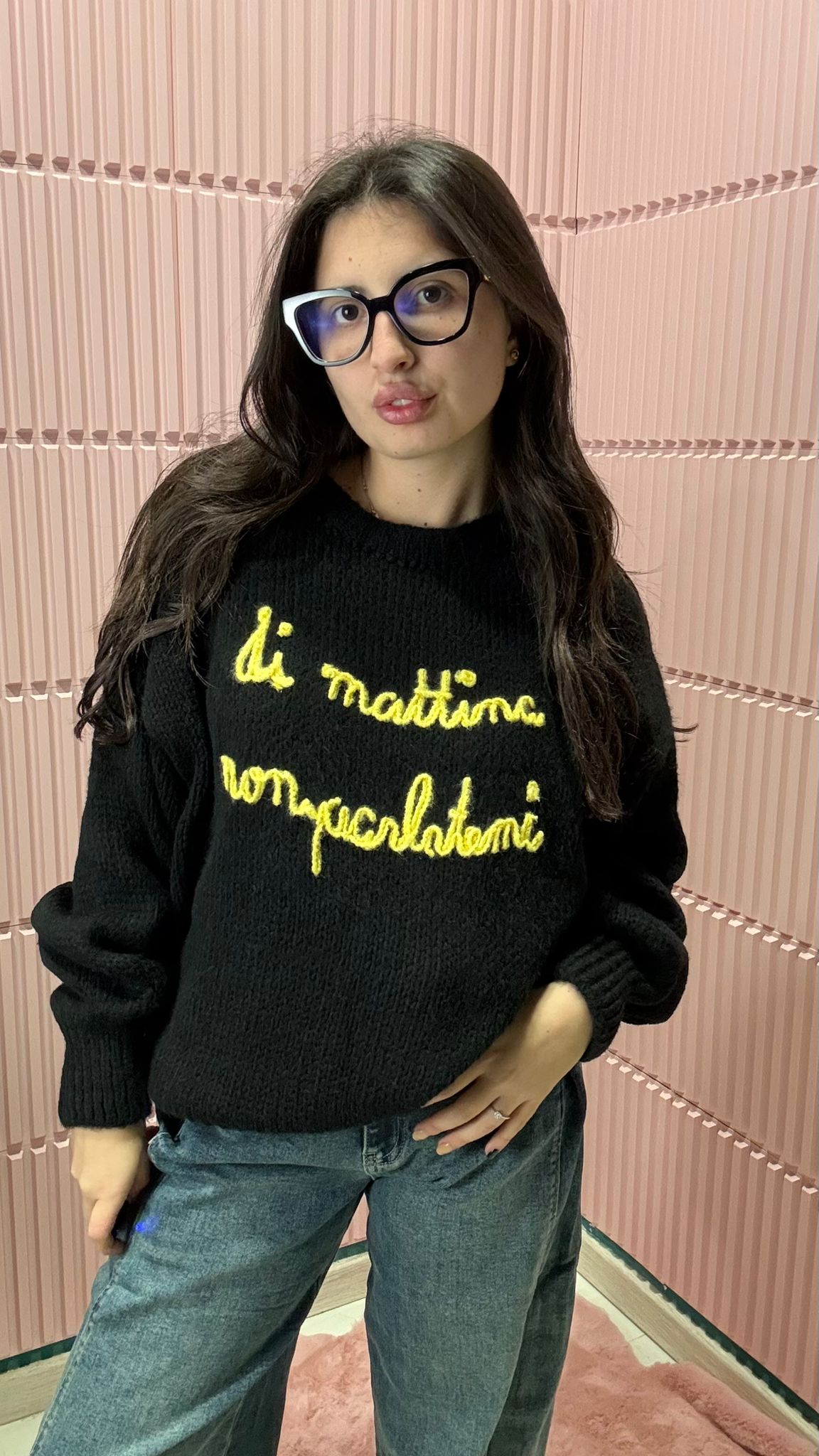 Per chi al mattino ha bisogno di un litro di caffè e zero conversazioni, questo maglione è un manifesto di sopravvivenza quotidiana.