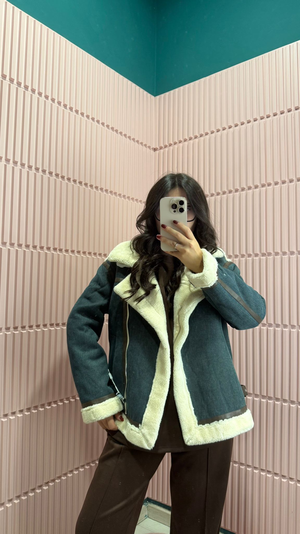 Giacca in shearling effetto denim , calda e avvolgente, con interno in pelliccia color panna. Chiusura con zip asimmetrica e dettagli in ecopelle a contrasto per un look urban chic perfetto per la stagione fredda.