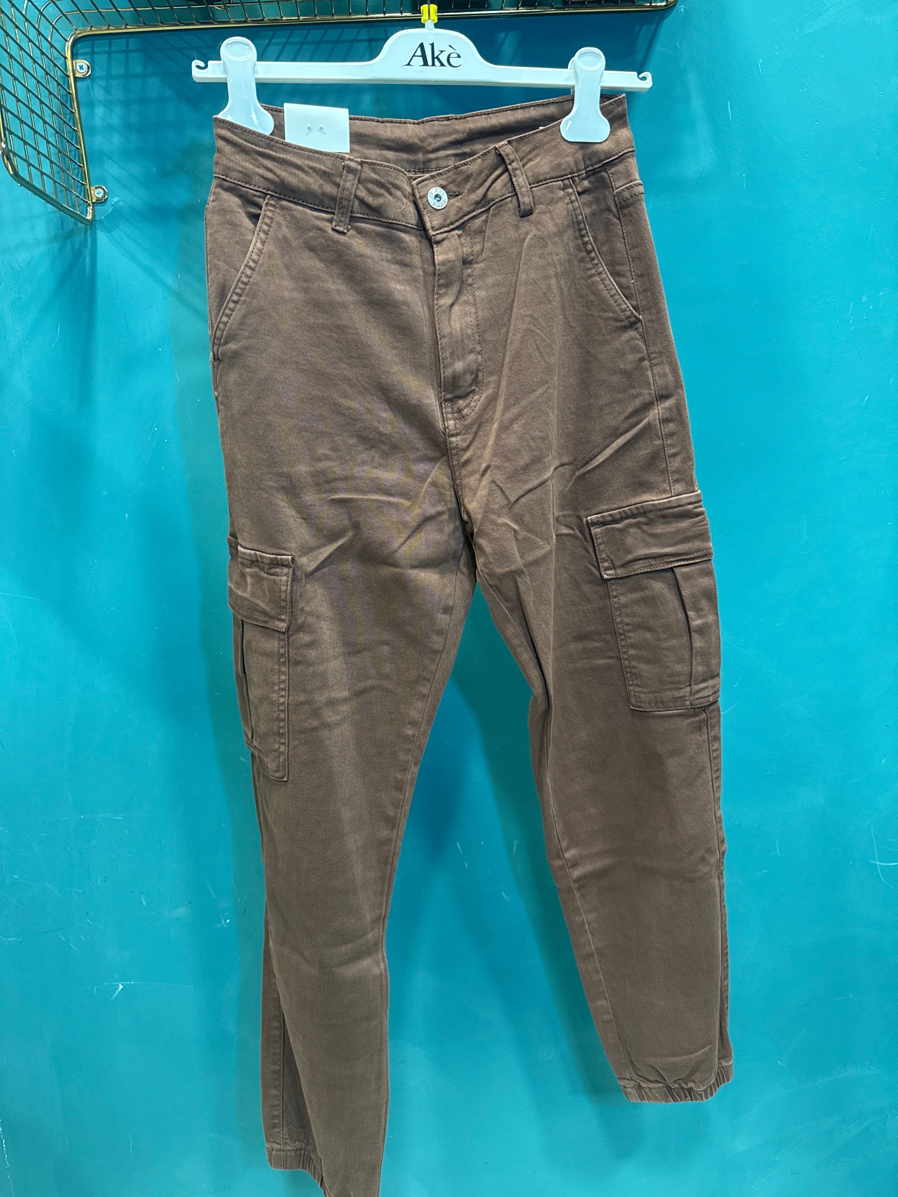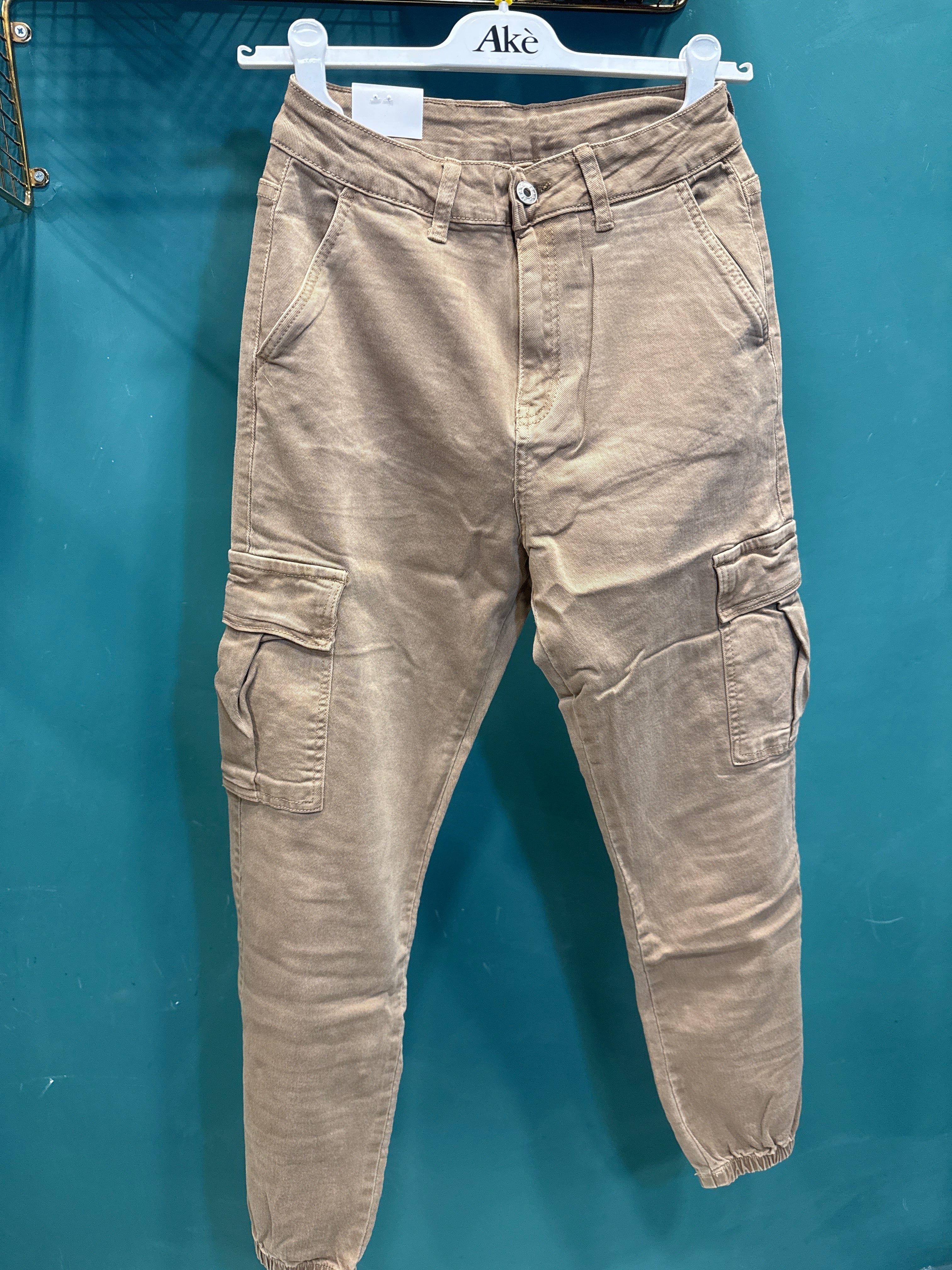 Pantalone cargo bianco a vita alta, con tasconi laterali e vestibilità morbida, dallo stile casual ma moderno con polsino alla caviglia