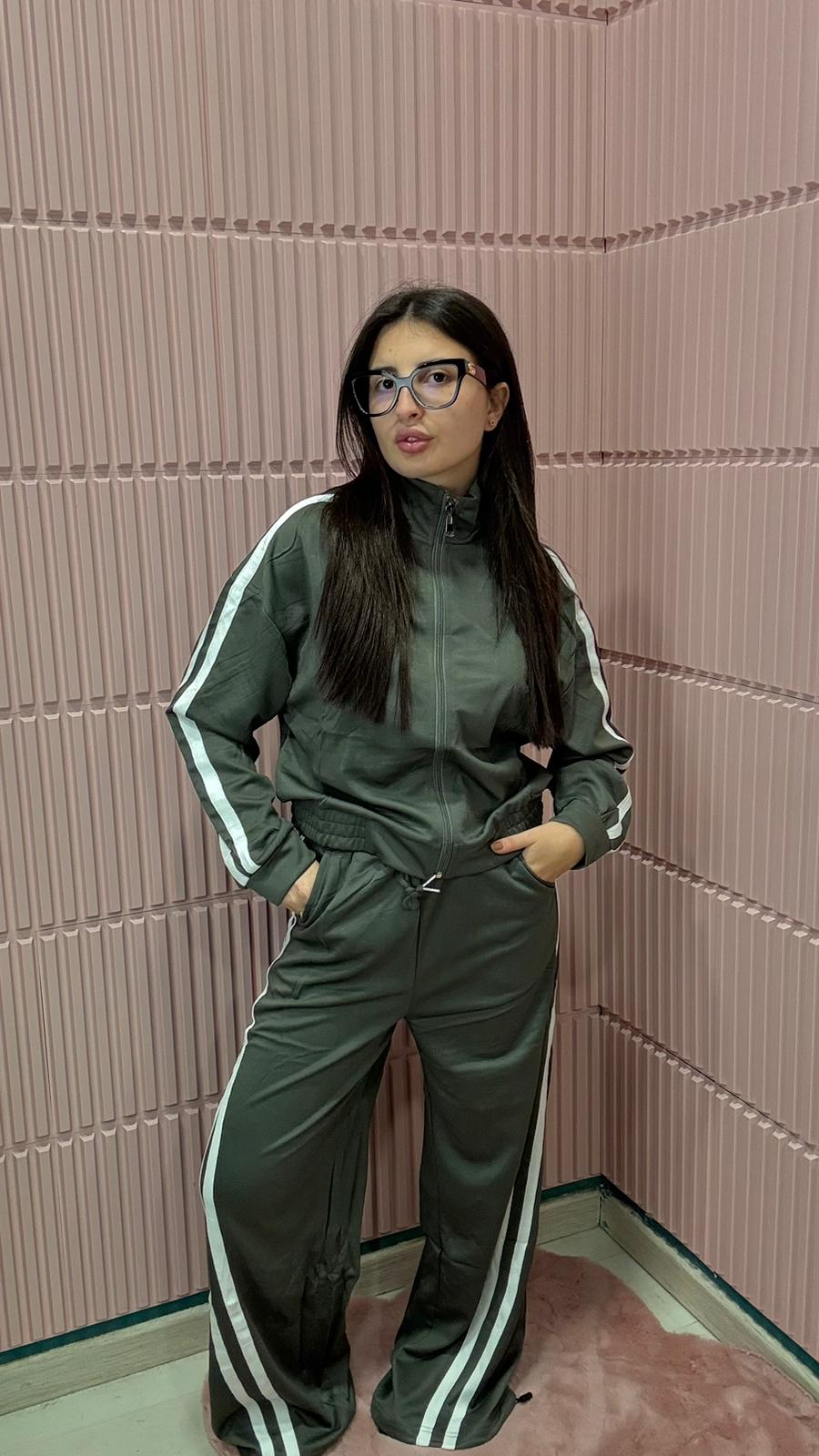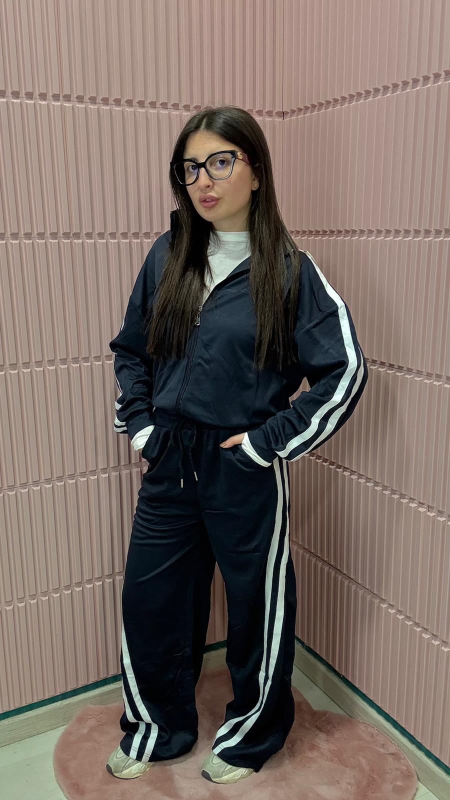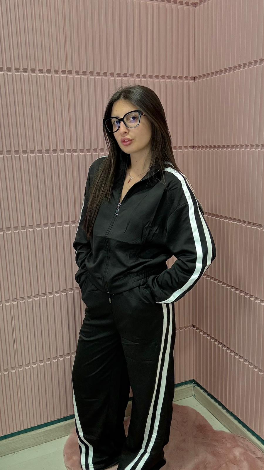 Tuta sportiva due pezzi dal design moderno e casual, perfetta per un look comodo ma sempre curato. Realizzata in tessuto leggero e morbido al tatto, è composta da una giacca con zip frontale e pantaloni con vita elasticizzata e coulisse regolabile. Le bande laterali bianche sulle maniche e lungo i pantaloni donano un tocco dinamico e contemporaneo, valorizzando la silhouette. Ideale per il tempo libero, le giornate casual o i momenti di relax, è una scelta versatile che unisce comfort e stile in un unico capo.